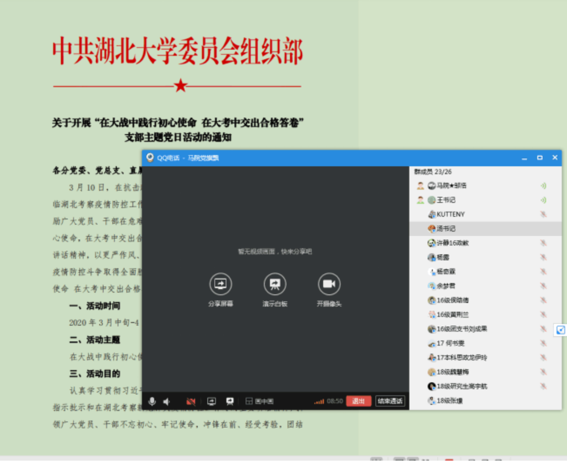 组织员邹浩介绍了有关公司党委组织部《关于开展“在大战中践行初心使命 在大考中交出合格答卷”支部主题党日活动的通知》。为进一步传达公司主要文件精神,公司党委副书记王雄对开展3月份党支部主题党日活动作出3点说明:一是严格按照公司下发的文件内容,重点围绕“做什么,怎么做”,特别是结合下沉到社区的抗击疫情案例,深入开展讨论和交流;二是开展好主题党日活动,把主题党日作为巩固“不忘初心、牢记使命”主题教育成果的具体行动。通过学习各类媒体、平台有关抗击疫情、下沉一线的真实事例,培养和提高党支部党员、预备党员和入党积极分子的责任担当,大力营造强信心、暖人心、聚民心的良好氛围;三是不断增强“四个意识”,坚决做到“两个维护”,对当前国内外抗击疫情的认识和行动,始终与党中央保持高度一致,敢于同不正确的言论做斗争,并在斗争中不断提升自身政治素养和理论素养。王雄副书记还对特殊时期做好本学期员工党建工作提出了3点意见:一是各党支部要结合各自实际,坚持每月召开网上党支部大会,并鼓励多形式开展党员活动;二是支委成员要协助支部书记做好本支部党建工作;三是毕业生党员要严格遵守党章规定的各项纪律要求,按时参加所在党支部的活动。