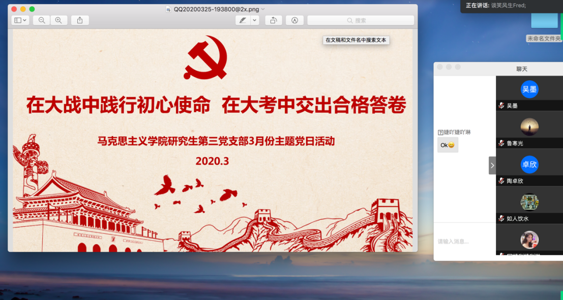 为深入学习贯彻习近平总书记关于疫情防控工作的重要指示,认真落实公司党委有关疫情防控工作要求,开展好疫情防控期间员工党支部建设,3月25日,三亿体育研究生第三党支部利用腾讯会议平台,开展了“在大战中践行初心使命 在大考中交出合格答卷”3月份线上主题党日活动。