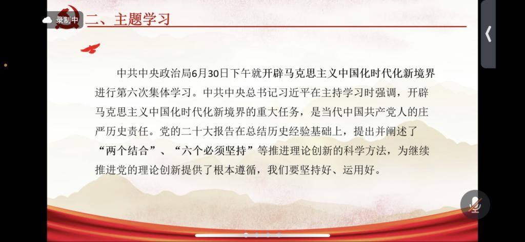 会议伊始,田敬同志带领全体党员诵读党章。随后,田敬同志带领全体党员学习习近平总书记在中央政治局第六次集体学习时的重要讲话精神,播放相关解读视频带领全体党员深度领悟其精神。田敬同志就习近平总书记重要讲话精神凝练出以下四点:第一,我们决不能抛弃马克思主义这个魂脉,决不能抛弃中华优秀传统文化这个根脉;第二,要及时科学解答时代新课题;第三,推进理论的体系化、学理化,是理论创新的内在要求和重要途径;第四,要注重从人民群众的创造中汲取理论创新智慧。