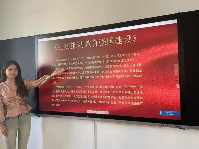 在完成重温入党誓词、交纳党费、诵读党章等规定动作后,支部宣传委员翦美玲同志领学了习近平总书记在《求是》杂志上发表的重要文章《扎实推进教育强国建设》。翦美玲同志从文章发表的背景、文章内容,以及文章的价值意蕴几个方面为大家作了详细的介绍。她指出,习近平总书记强调建设教育强国,是全面建成社会主义现代化强国的战略先导,是实现高水平科技自立自强的重要支撑,是促进全体人民共同富裕的有效途径,是以中国式现代化全面推进中华民族伟大复兴的基础工程。