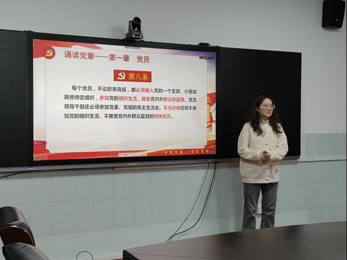 会议伊始,全体同志学习了党章第一章的第八条和第九条,张若扬同志、马晓娇同志为与会成员诵读党章。通过本次的党章学习,同志们再次明晰了身为党员按时参与党内组织生活和接受群众监督的的重要性及必要性。