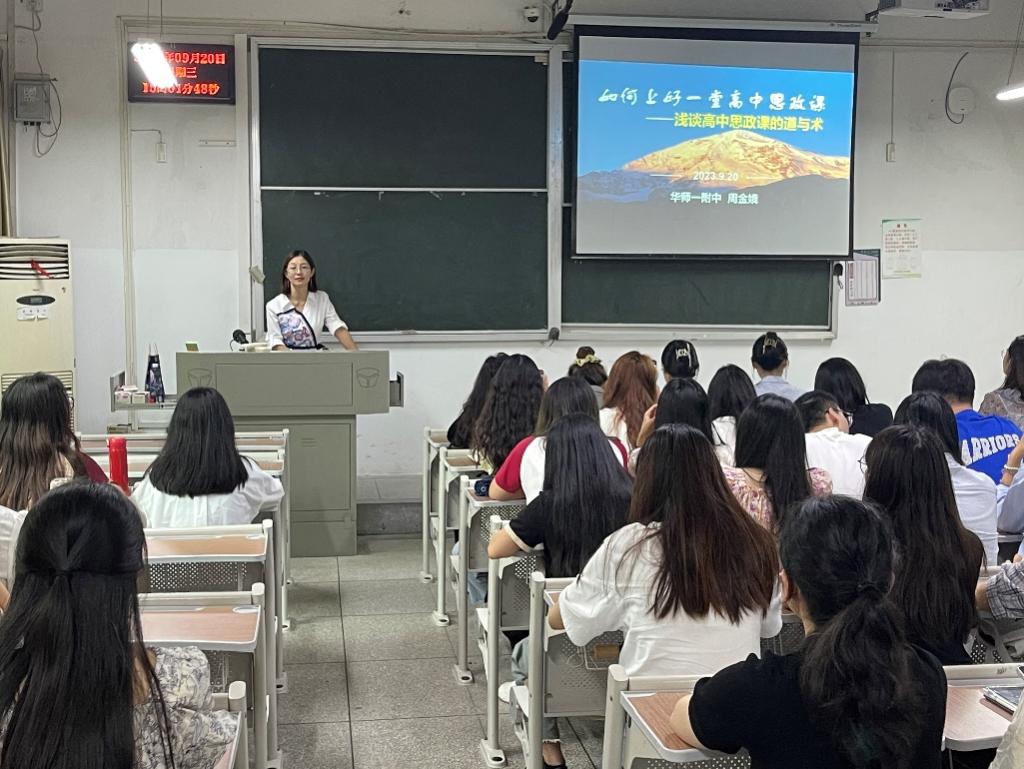 讲座会上,周金娥老师从“好课堂的基本要求”、“‘三新’背景下的教学理念”、“如何设计一节高标准思政课”、“优秀课堂示例”四个方面展开本次讲座。在介绍完一线思政课教师面临的挑战后,周老师对在场同学提出忠告,她表示,一名优秀的高中政治老师需要有坚定的政治方向、与时俱进的学习能力、语言的趣味性和思维的逻辑性,要不断学习充实自己,把教育当作责任担当,培养德智体美劳全面发展的员工。