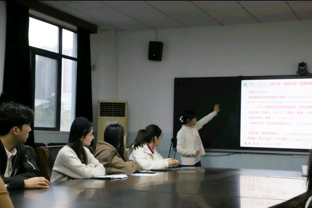 宣讲会伊始,宣讲成员周雯雯向大家介绍了“西部计划”的具体内容。在政策解读环节,宣讲成员熊静蕾从“西部计划”服务内容、选拔标准和待遇等方面进行解读。接着,他们向同学们展示了历届参与“西部计划”的志愿者学长学姐,以实际经历诠释青春的价值与意义,拉近了同学们与西部的距离,让同学们深切感受到榜样的力量,从未激发内心深处的奉献热情。