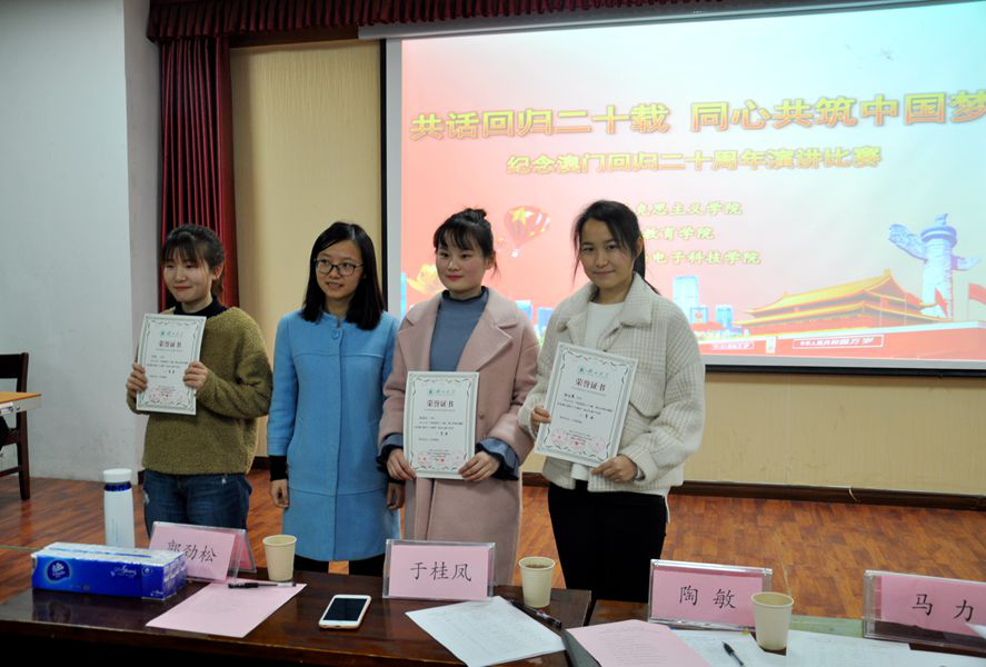 经过两个环节的比拼,来自物理与电子科技公司的郭雪如以《澳门:过去、现在、未来》为主题,凭借优美的表达、饱满的激情和铿锵的节奏获得在场师生的认同,并以95.35分夺得冠军。公司杜佳贝、郭佳慧组获得二等奖,李睿、李俏娴组和林婉、王婷婷、王昭君组获得三等奖,杨露、王立雪组和秦依、赵司宇组以及李菀获得优胜奖。