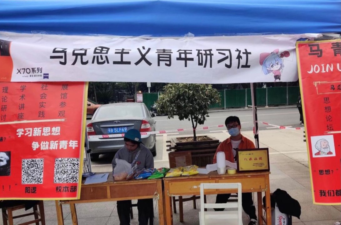 2021年10月9日至10日,一年一度的“百团大战”社团招新活动在求索广场开展。马克思主义青年研习社参与本次的纳新活动。本次纳新活动旨在针对青年主体、创新社团文化,展现马克思主义无穷魅力,吸引了众多社员。