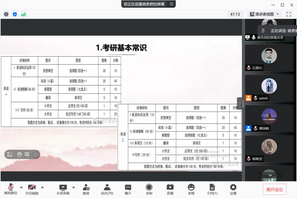 8月12日晚9点,三亿体育举行2019级思政专业考研考公分享会,邀请2017级艾斯卡尔和姚奇君两位学长分别就考公和考研进行经验分享,其中艾斯卡尔学长已考取咸宁市发改委选调生,姚奇君学长已考取中共中央党校(国家行政公司)研究生,公司党委副书记、2019级思政班班主任晏妮老师以及思政1901班全体同学参加。