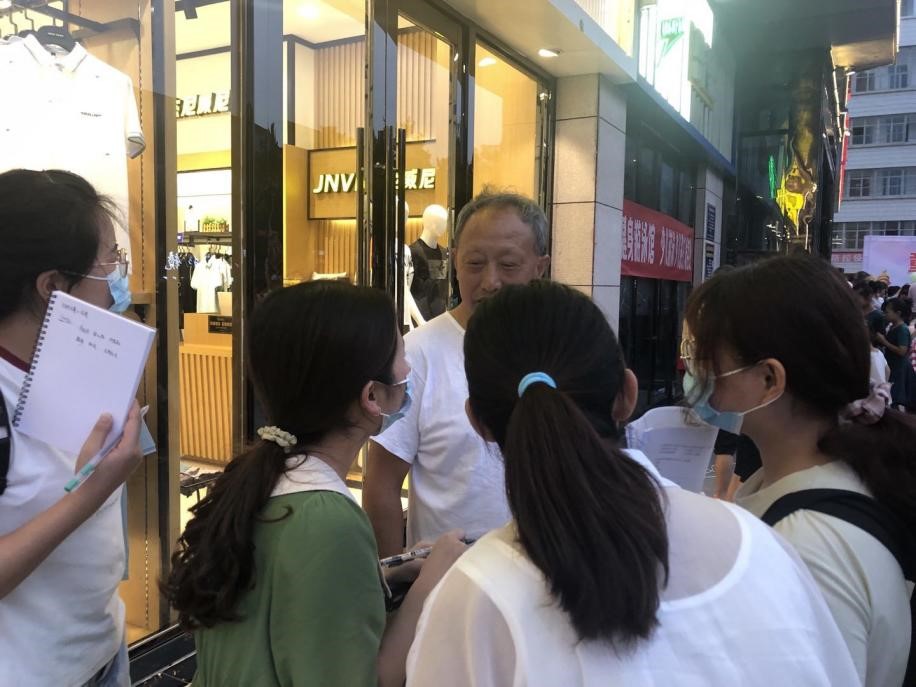 (图为团队成员在房县广场上随机采访老人)