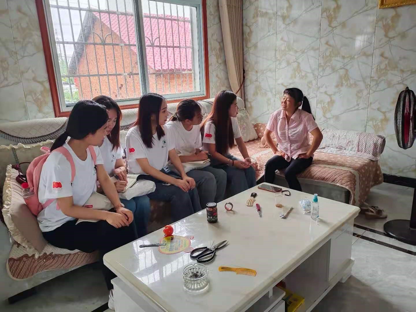 (图为团队成员深入到群众家里,和群众交流访谈)