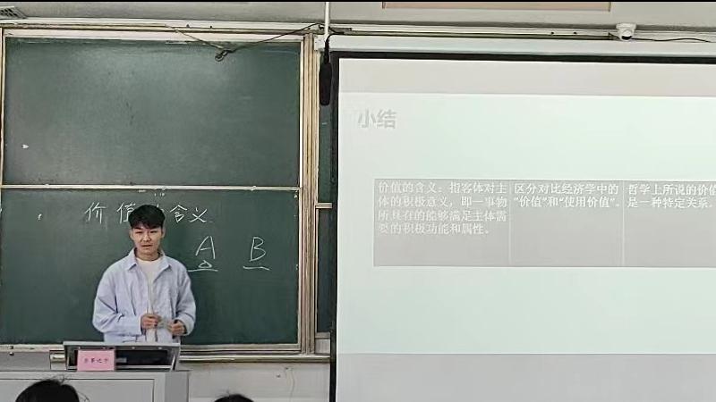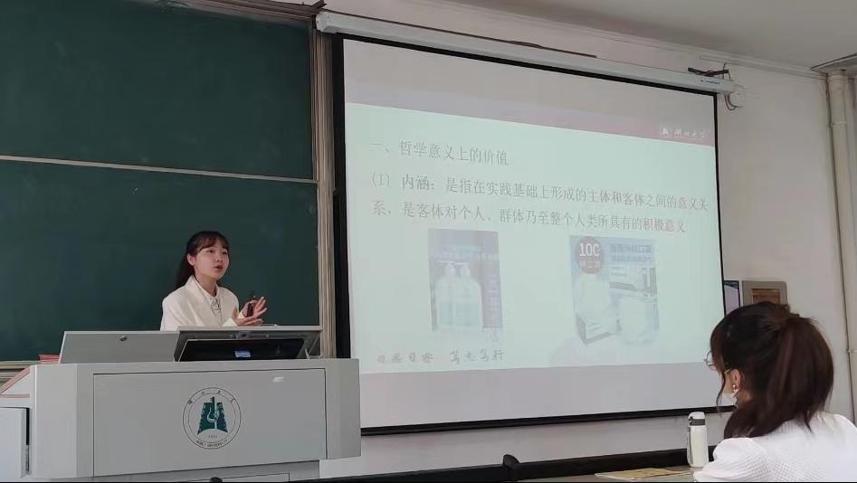 21级学科思政研究生王琴的授课内容是高中政治必修四《哲学与文化》中的“哲学意义上价值的特征”。她采用案例教学法,通过讨论疫情期间大家所准备的各种防疫物品,引出哲学意义上价值的内涵和特征,引导员工应不断充实自己,全面发展,最终实现人的真正价值。