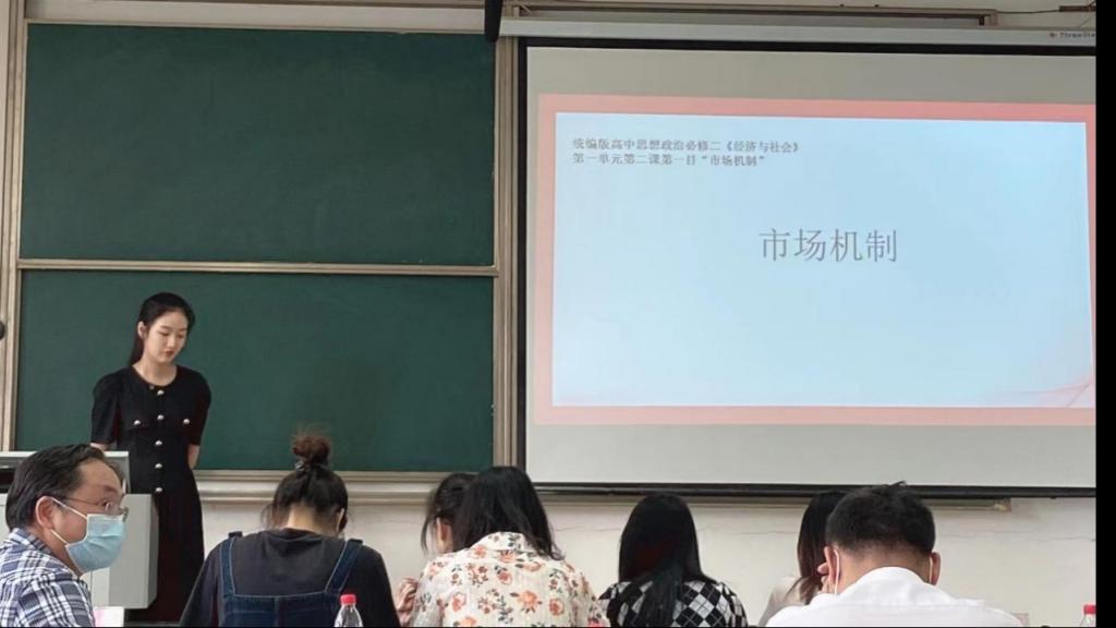 21级学科思政研究生李俊娴的授课内容是高中思想政治必修二《经济与社会》中的“市场机制”。她采用情境教学法,以电影行业的整个发展过程来导入课程,用市场配置电影资源的三种机制使员工明白社会主义市场经济的重要性和优越性,提升员工对社会主义市场经济的认同感,树立制度自信和道路自信。