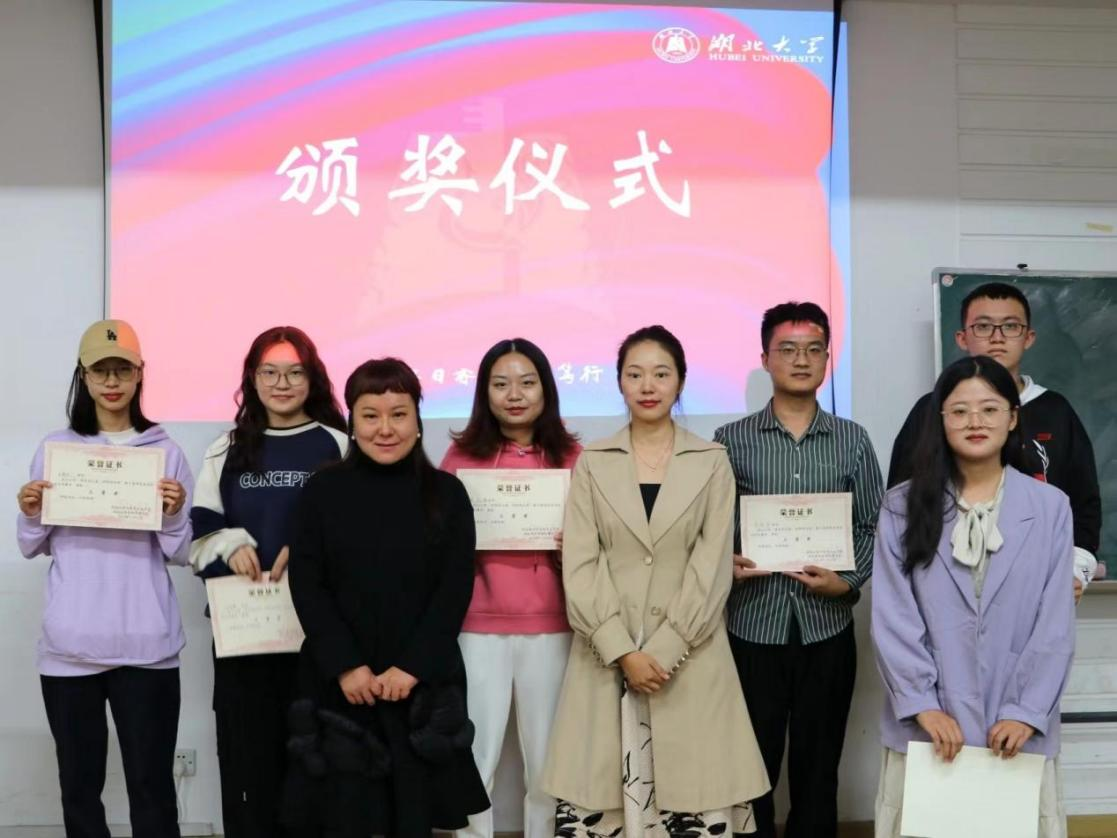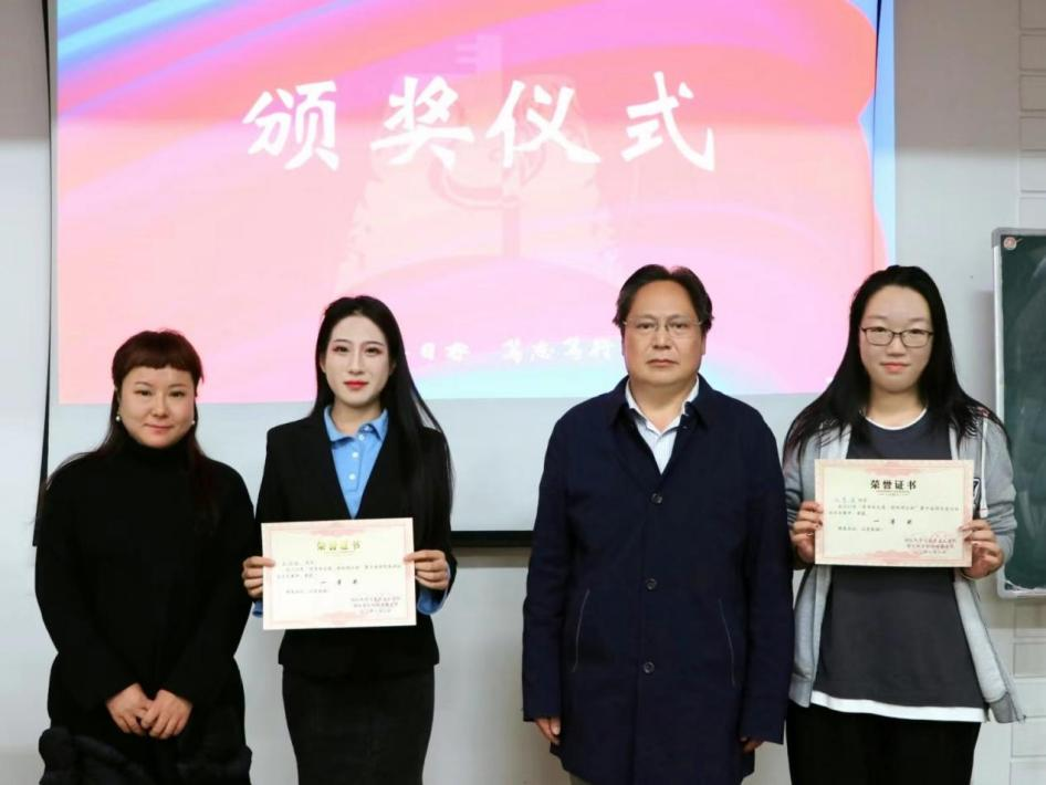 (图为三亿体育卢国琪老师,新闻传播公司罗宜虹老师为获得一等奖的选手颁奖)