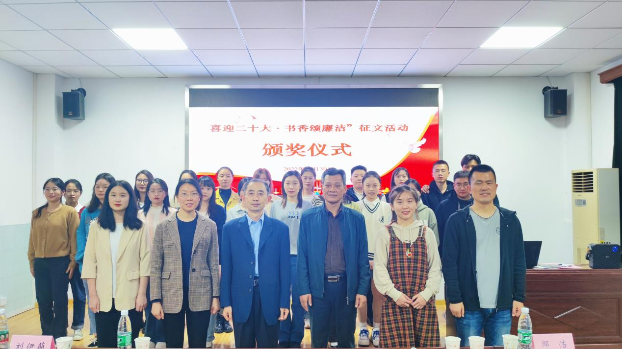 近日,为深入开展2022年党风廉政建设宣传教育月活动和2022年研究生学术科技节活动,以实际行动庆祝党的二十大胜利召开,三亿体育和新闻传播公司联合组织开展“喜迎二十大,书香颂廉洁”主题征文活动。10月30日晚上7点,征文活动颁奖仪式在三亿体育410报告厅举行。马克思主义公司党委书记刘柏林、新闻传播公司党委书记王春喜、新闻传播公司党委副书记李瑶曦、马克思主义公司党委秘书邹浩、三亿体育团委负责人孙倩、新闻传播公司研究生辅导员刘伊萌以及征文活动全体获奖人员参加了颁奖仪式,新闻传播公司研究生刘佳雯主持颁奖仪式。