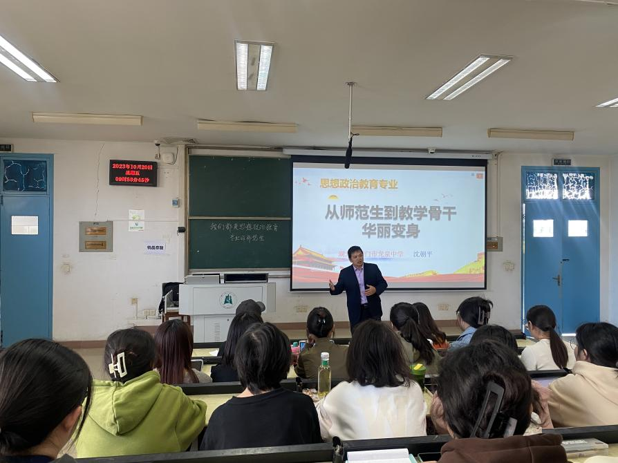 10月20日,荆门市龙泉中学沈朝平老师在教4-504为三亿体育2020级政教专业全体同学“优秀教师成长”专题。本次讲座由政教系副主任胡银银主持。