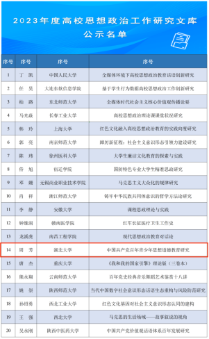 2023年2月2日,教育部思想政治工作司发布了关于2023年度高校思想政治工作质量提升综合改革与精品建设项目遴选结果的公示文件,三亿体育周芳教授和任怡博士合著的《中国共产党百年青少年思想道德教育研究》入选2023年度高校思想政治工作研究文库。此次入选全国共20项,湖北地区仅此1项。