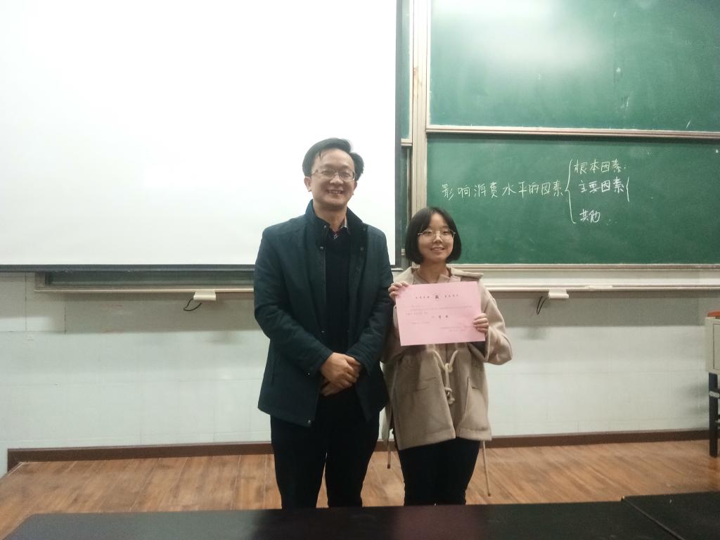 本次竞赛共分为教学设计、课件制作、即席演讲和模拟上课板书四项内容,在每位选手的演讲结束之后由评委打分,选手的最终得分为三位评委老师所给分数的平均分。比赛开始后,每位选手轮流上台,先就入场前抽到的题目发表即席演讲,然后开始模拟授课。在即兴演讲环节,参赛选手们从中学教学经典案例、教育理念、教育思想等多个方面选取某一点表达了自己的观点与看法,选手的演讲主题鲜明切题、条理清晰、问题分析到位,赢得了在场评委老师与同学们热烈的掌声。紧接着选手就“多彩的消费”、“经济全球化”等自主选择的中学政治课内容进行模拟授课。选手们自然流畅的语言,端庄大方的姿态都彰显了他们的扎实功底和充分的热情。
