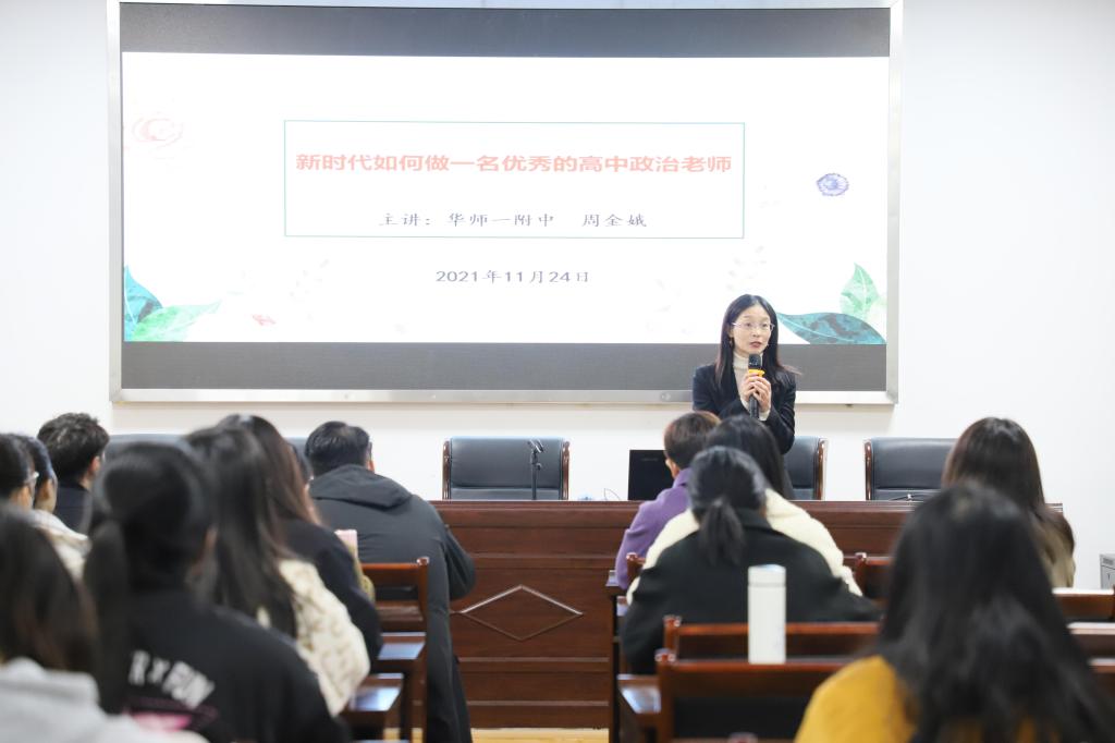 11月24日晚,公司在四楼报告厅,举行聘任华中师范大学第一附属中学周金娥老师为硕士专业学位校外导师仪式,并邀请其作 “新时代如何做一名优秀的高中思政课教师”的主题讲座。公司副经理易振龙、教育硕士专业学位负责人姚迎春副教授,20级和21级学科思政研究生及本科生代表共70余名员工参加此次讲座。讲座由姚迎春主持。