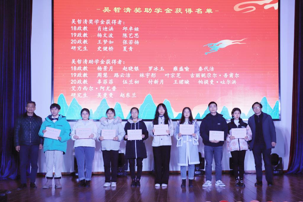 公司领导和老师为本年度吴哲清奖助学金、汪彬奖学金、文明寝室、优秀员工干部获奖员工颁奖并合影留念。