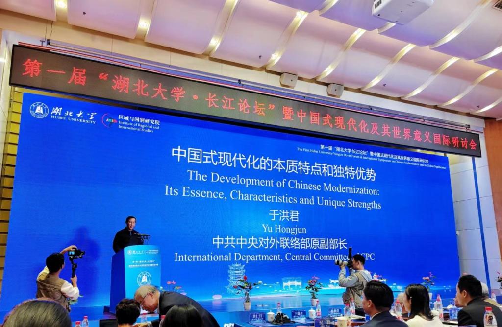 此次论坛下设“中国式现代化的内涵”“中国式现代化与全球治理”“中国式现代化的世界意义与比较研究”三个单元,以及“中国式现代化与长江文化”“中国法律现代化及其世界意义”两个分论坛。中共中央对外联络部原副部长于洪君,中国外交部拉丁美洲和加勒比司司长蔡伟,湖北省人民政府副秘书长何丽君,湖北省人民政府外事办公室主任章笑梅,中国社会科公司拉丁美洲研究所荣誉学部委员徐世澄研究员,中国人民大学国际关系公司金灿荣教授,中央党校国际战略研究院副经理吴志成教授,南京大学区域国别研究院王逸舟教授等专家学者出席会议并发言。公司董事长刘建平教授代表公司致辞,公司党委副书记祝欣主持会议开幕式。公司贺祥林教授、副经理易振龙教授,以及龚梦、胡银银、王敏、陈晨、王勇、沈钰晶、冷自衍等年轻老师参会。博士研究生刘秋岑、田敬参加会议并在分论坛作学术发言。