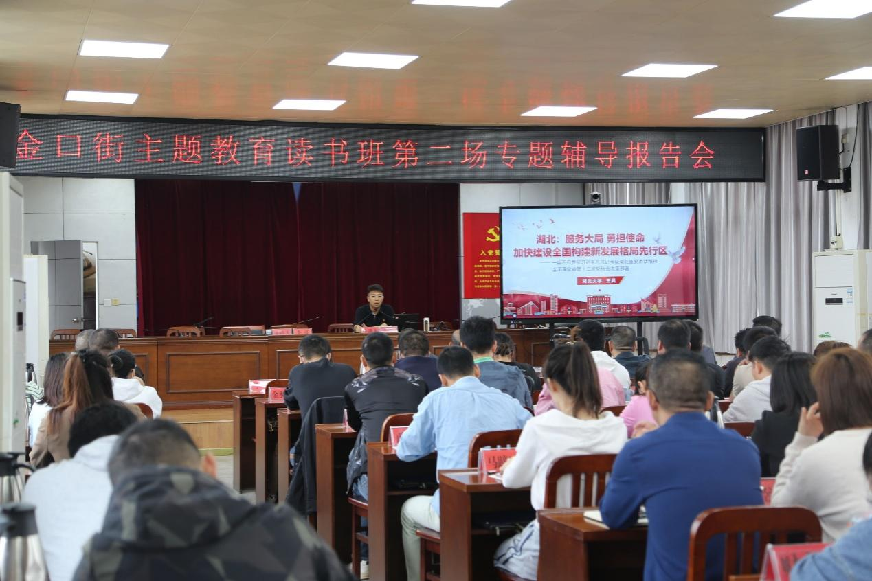 1010日、12日,应公司”理论热点面对面“实践基地(江夏区金口街道)的邀请,公司易振龙教授、王昊博士分别为江夏区金口街道主题教育读书班作理论报告。金口街道党工委班子成员、村(社区)书记、后备干部200余人参与报告会。